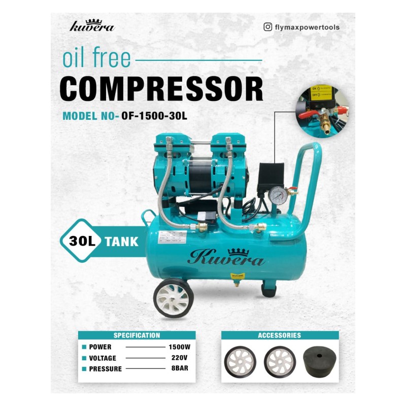 Kuvera Kuvera 1500W Oil Free Air Compressor 30Ltr - OF-1500-30L