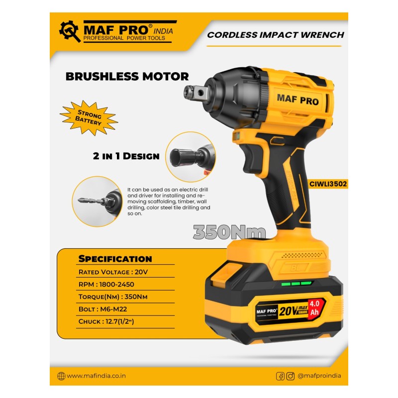 MAF MAF PRO 20V CORDLESS IMPACT WRENCH 1/2" SQ. DRIVE BRUSHLESS MOTOR 350NM - CIWLI3502
